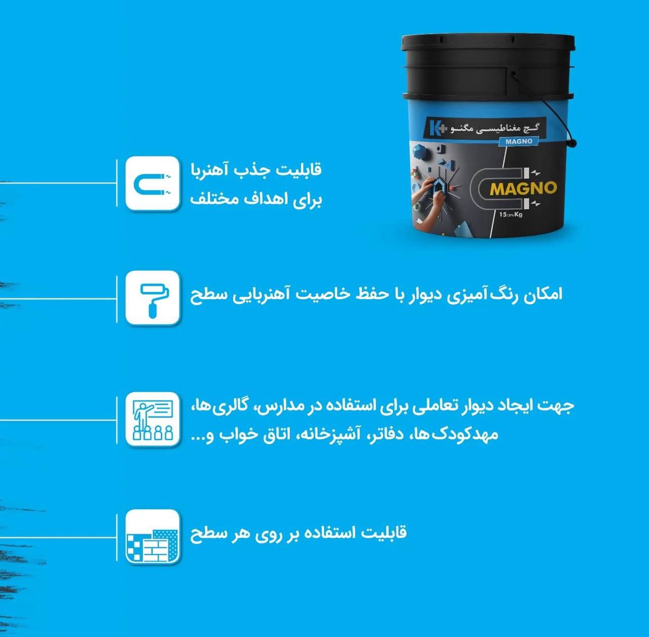 گچ مغناطیسی مگنو، سطحی با قابلیت جذب آهنربا به وجود میآورد که برای اهداف مختلفی قابل بهره برداری است.